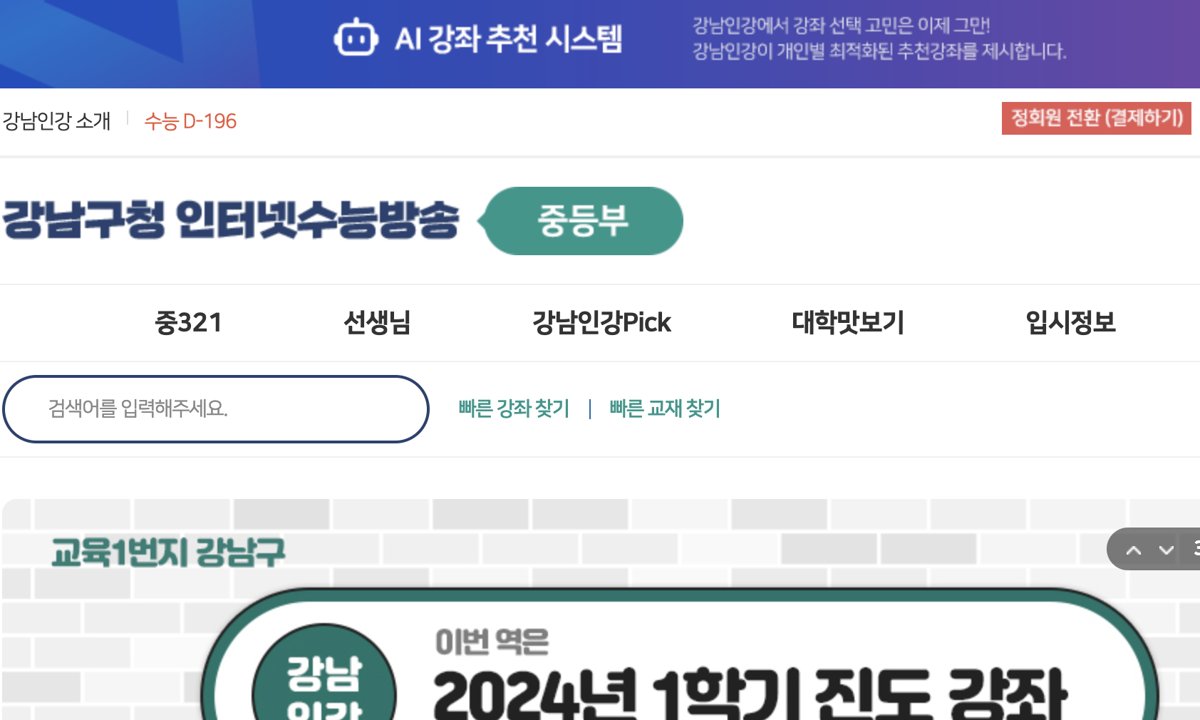 강남구에서 제공하는 온라인 강의학습 플랫폼입니다.사교육비 감소와 중,고생의 자기주도학습을 위한 수준높은 강의가 연간 5만원에 제공됩니다.