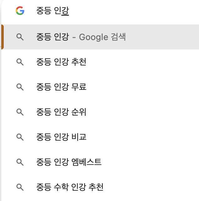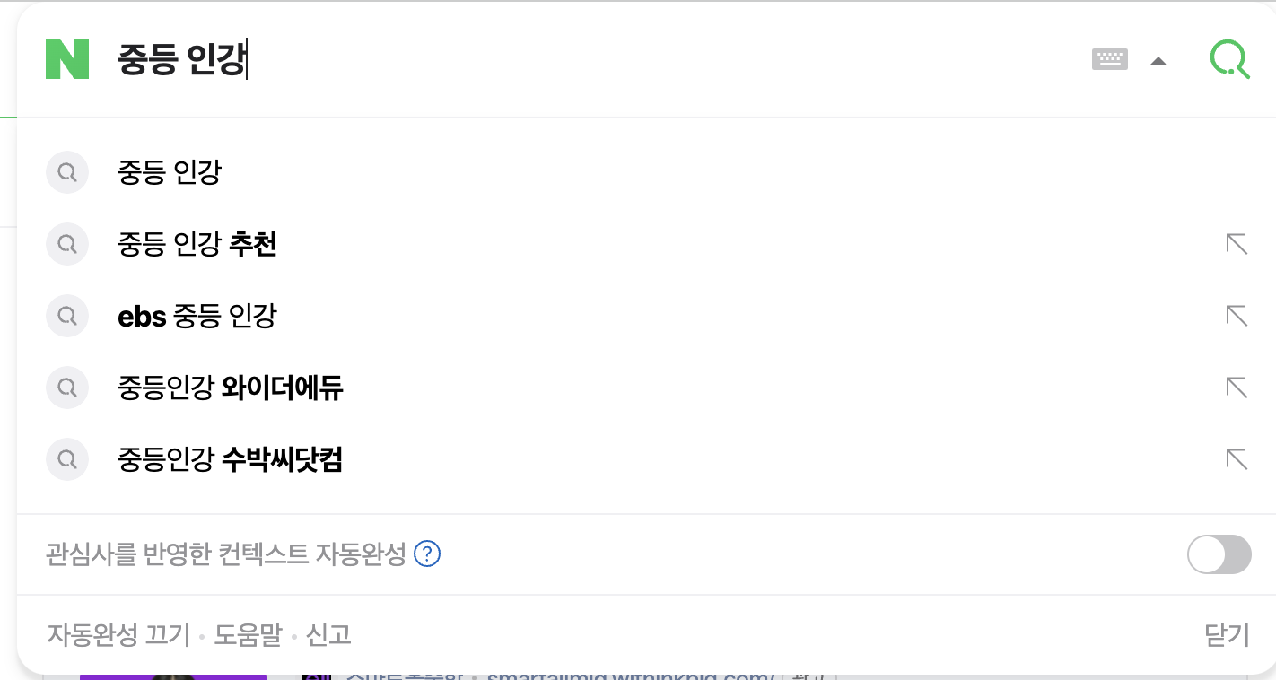 검색포털에서 중등인강을 검색해보았습니다. 네이버에서 검색하니 ebs, 와이더에듀, 수박씨닷컴이 연관검색어에 등장합니다.