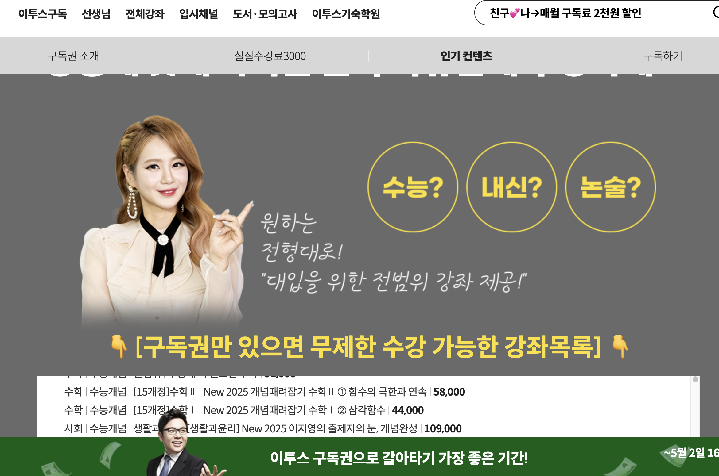 연관검색결과에는 없었지만 워낙 유명한 선생님들이 있는 이투스도 소개합니다. 수학의 정승제선생님, 사회 이지영선생님을 모르시는 분들이 적을 것 같아요. 이투스는 월 3만원 상당의 구독 요금제가 있습니다. 저는 개인적으로 이투스를 구독할까 고민중입니다.